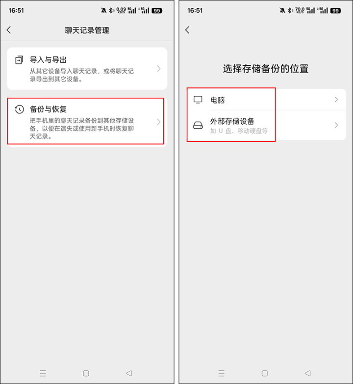 另外,在【聊天记录管理】下大家还可以看到一个叫【备份与恢复】的功能,如果你手机内存不足了,那么就可以通过这个功能将微信聊天记录备份到电脑或U盘里,有了备份之后,哪天要是误删了聊天记录或是手机卡顿坏了,还可以从备份中将聊天记录恢复到手机上。