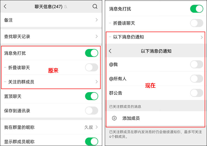 升级后,点击微信群右上角的【…】,开启【消息免打扰】后,可以看到,以前开启消息免打扰后底部只有【折叠该群聊】和【关注的群成员】两个选项的,现在开启消息免打扰后,除了【折叠该群聊】之外,多了一项【以下消息仍通知】,有“@我”、“@所有人”、“群公告”、“已关注群成员的消息”四个选项,如果你希望群可以彻底清净,那么这些选项都保持关闭状态就好,这样以后就算这个微信群发群公告或者艾特你,也不会收到提醒了。当然,微信也依然给大家保留了选择的空间,有的群你只是想屏蔽日常群聊而已,重要的消息比如“@所有人”“群公告”以及艾特你的和你关注的人的消息你还是希望可以收到的,那么你就可以根据自己的需要开启这些功能。